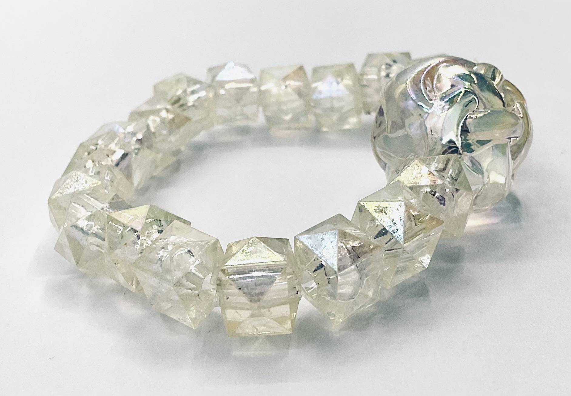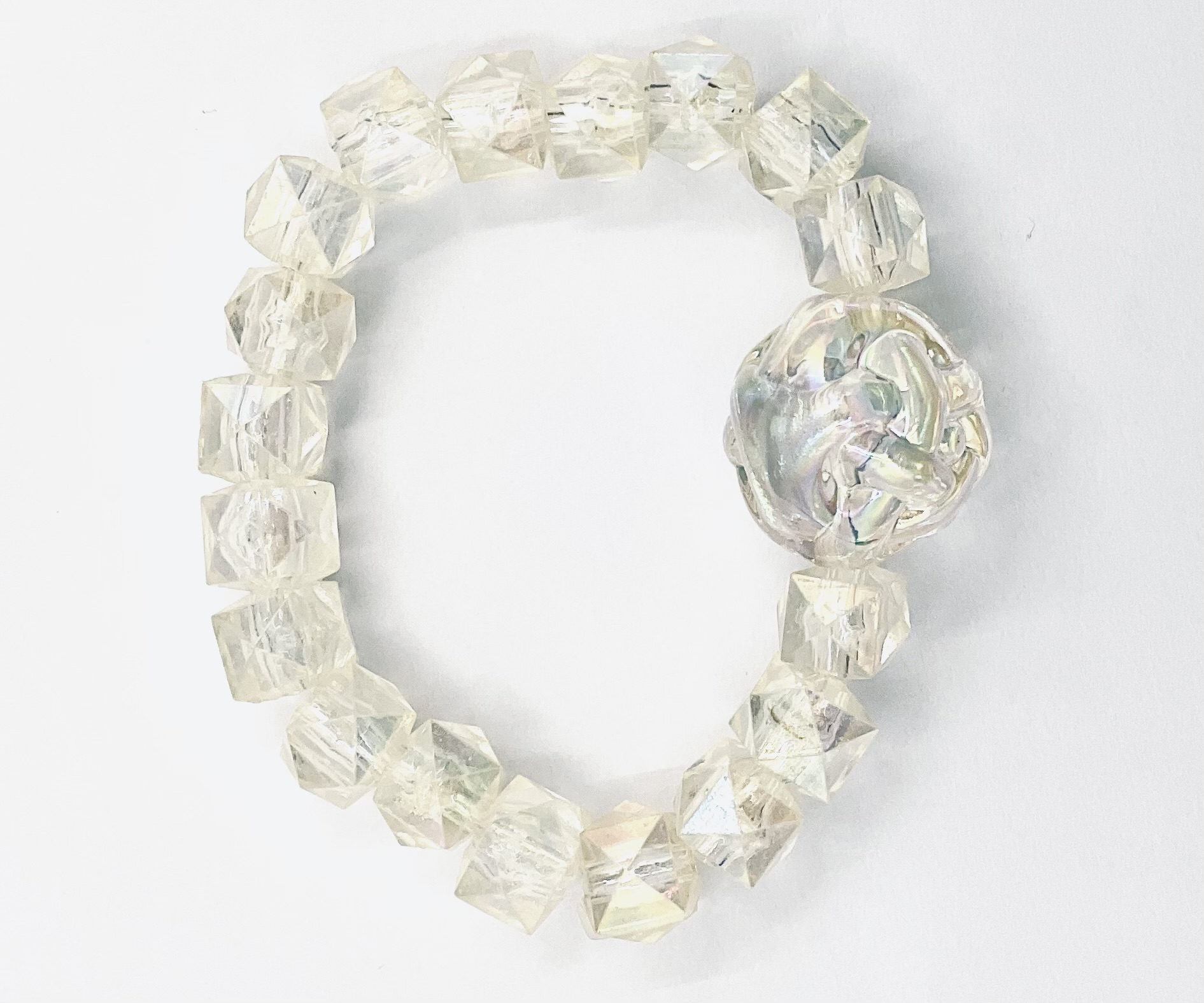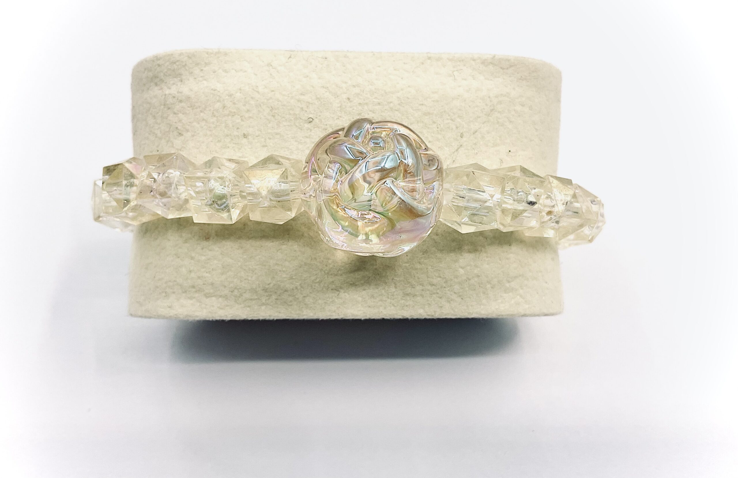 A small butter yellow bracelet with crystal cubes and a large yarn ball as a charm. Medium size 4cm